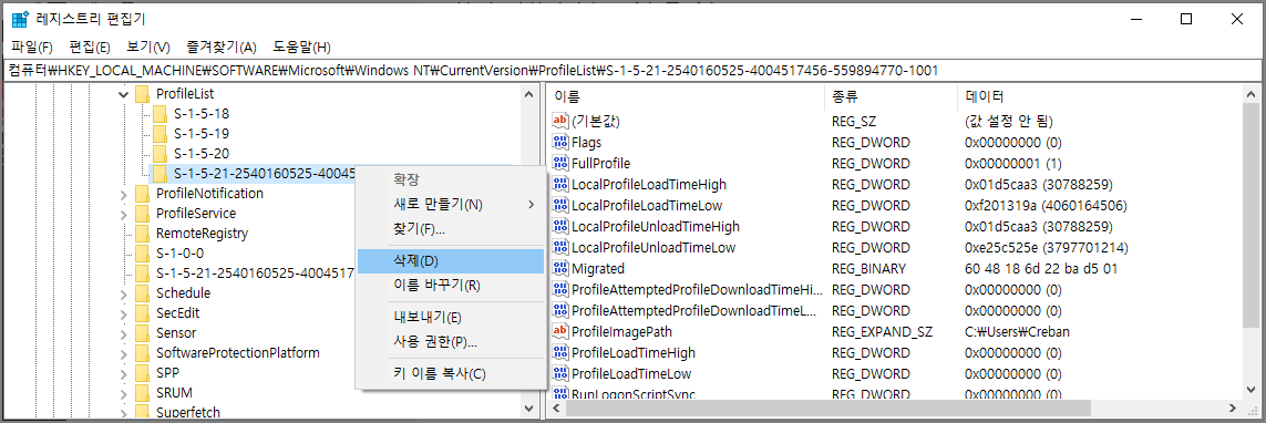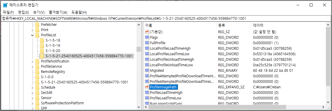 ③ 왼쪽 이른 긴 폴더들 중에서 ProfileImagePath 경로로 문제의 계정(예: C:\Users\Creban) 위치 찾음
