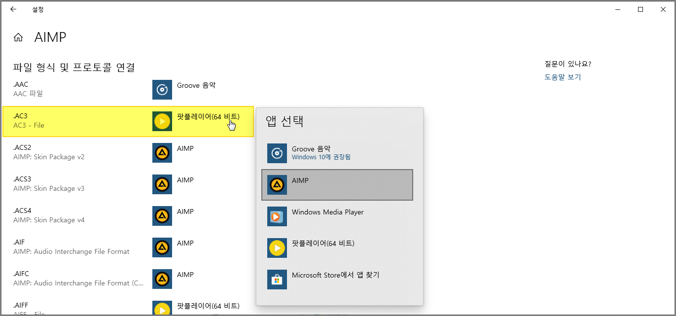 다음 팟플레이어를 설치하면서 기본프로그램에 등록했습니다.