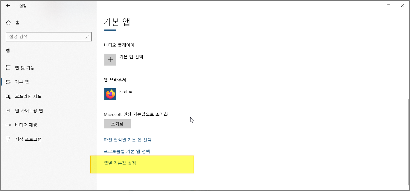 2. 설정 > 앱 선택 후 기본 앱에서, 앱 별 기본값 설정으로 변경 (제가 해 본 설정)