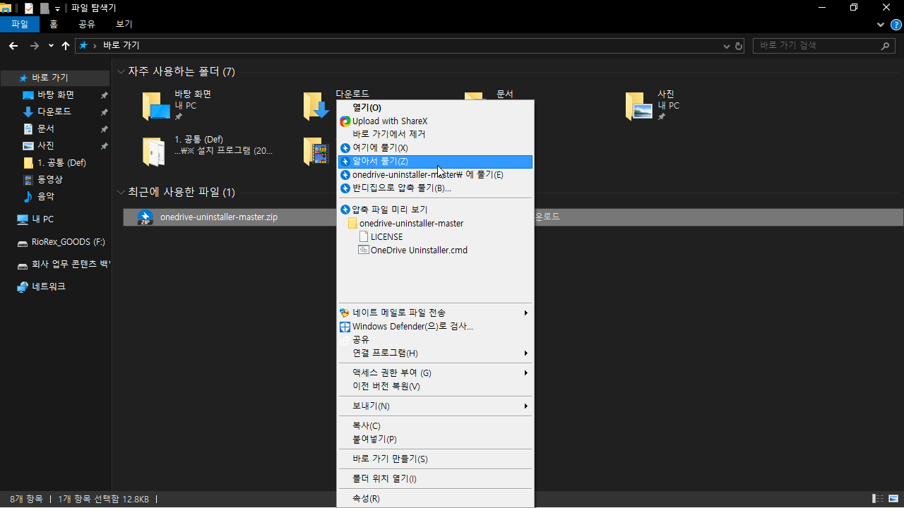 ③ OneDrive Uninstaller.cmd 파일을 마우스 오른쪽 버튼 클릭하여, 관리자 권한으로 실행한다.