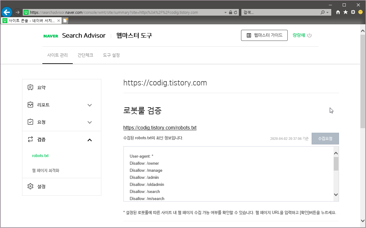 2. https://searchadvisor.naver.com/console/wmt/site/summary?site=https%3A%2F%2Fcodig.tistory.com