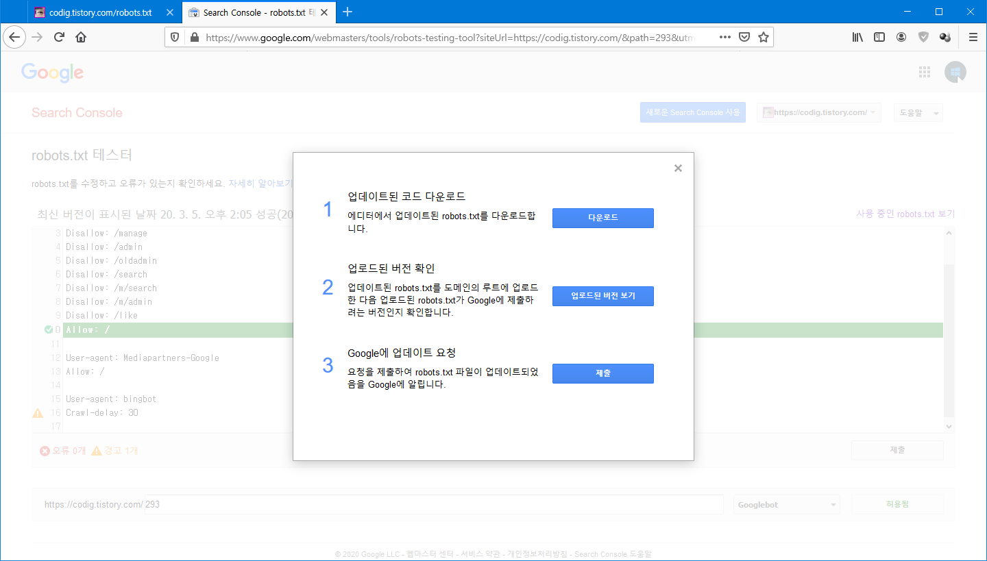 Google Search Console 에서 robots.txt 수정 제출하는 방법