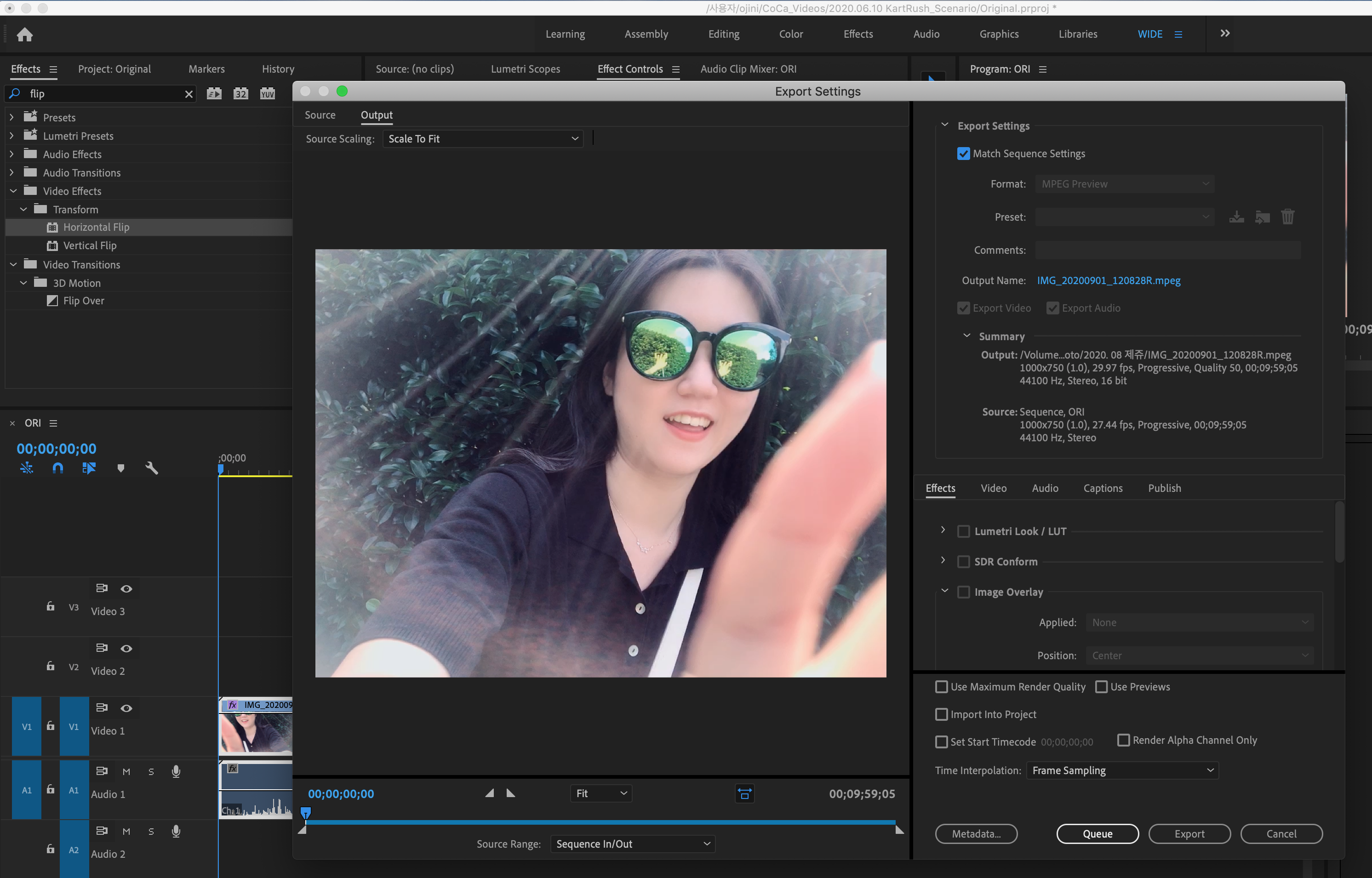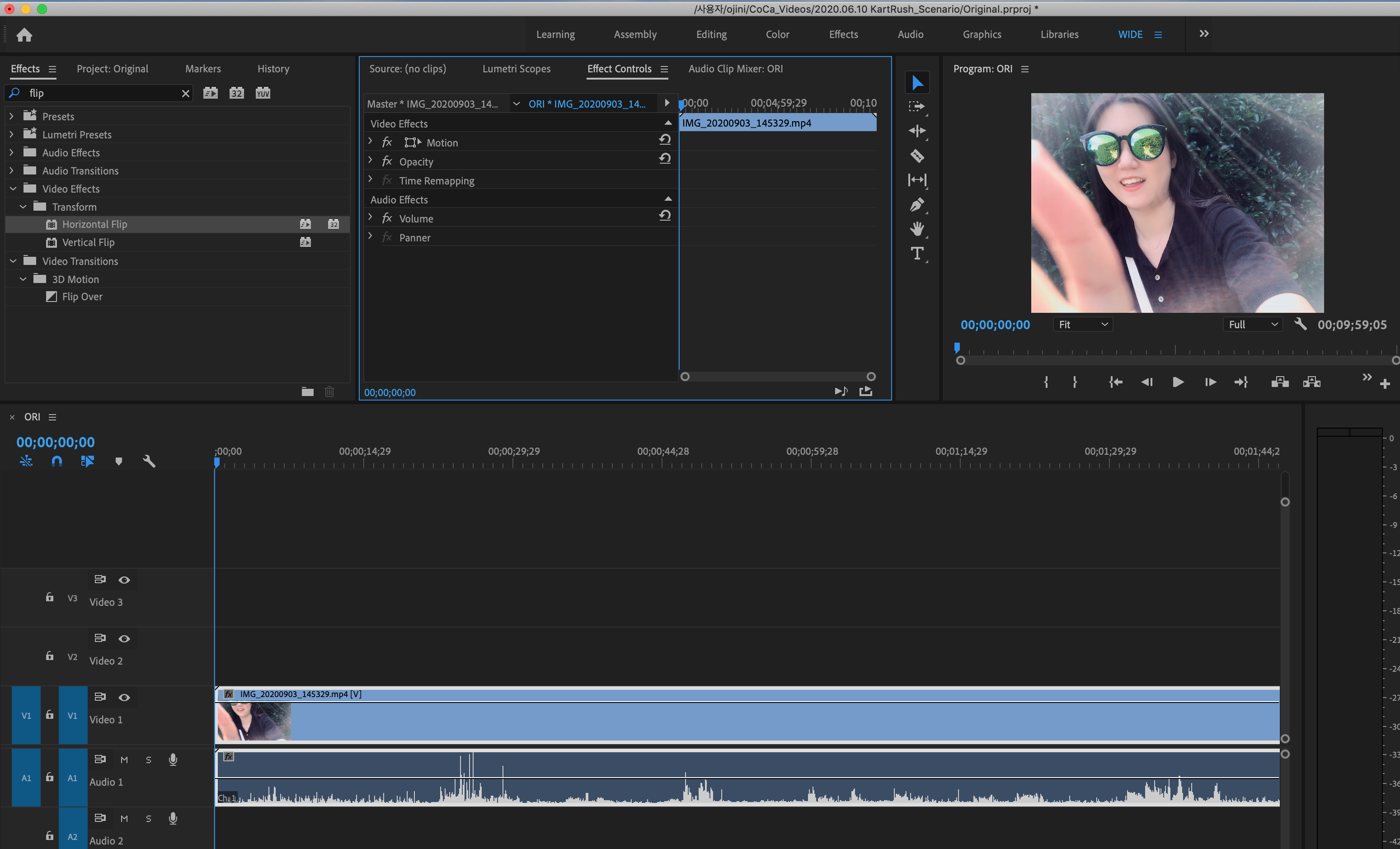 3. Effects 탭 (단축키 shift + 7) 에서 flip을 검색하여 Horizontal Flip을 선택합니다.