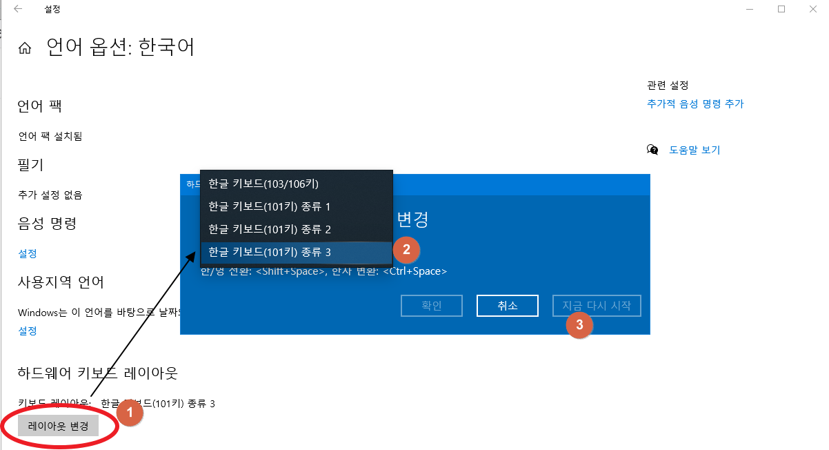 3. "레이아웃 변경" > "종류 3 선택" > "지금 다시시작"