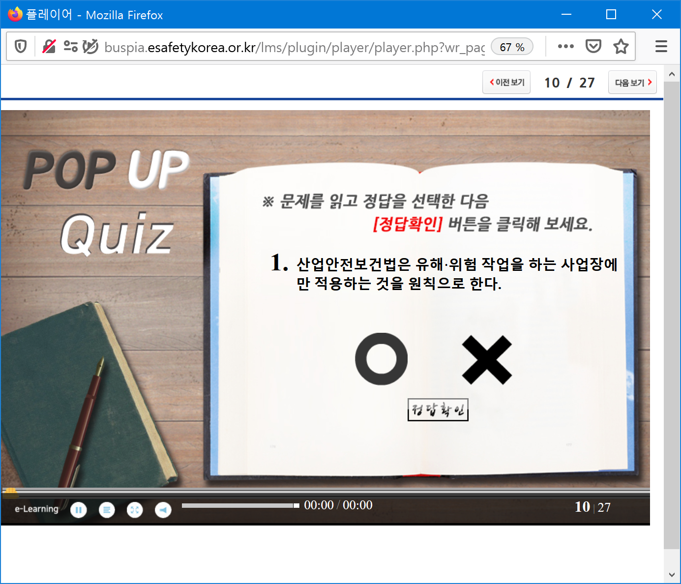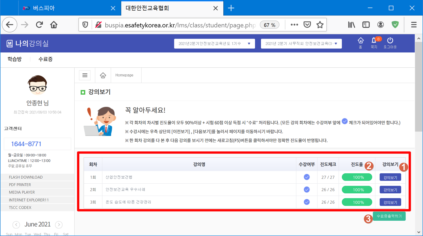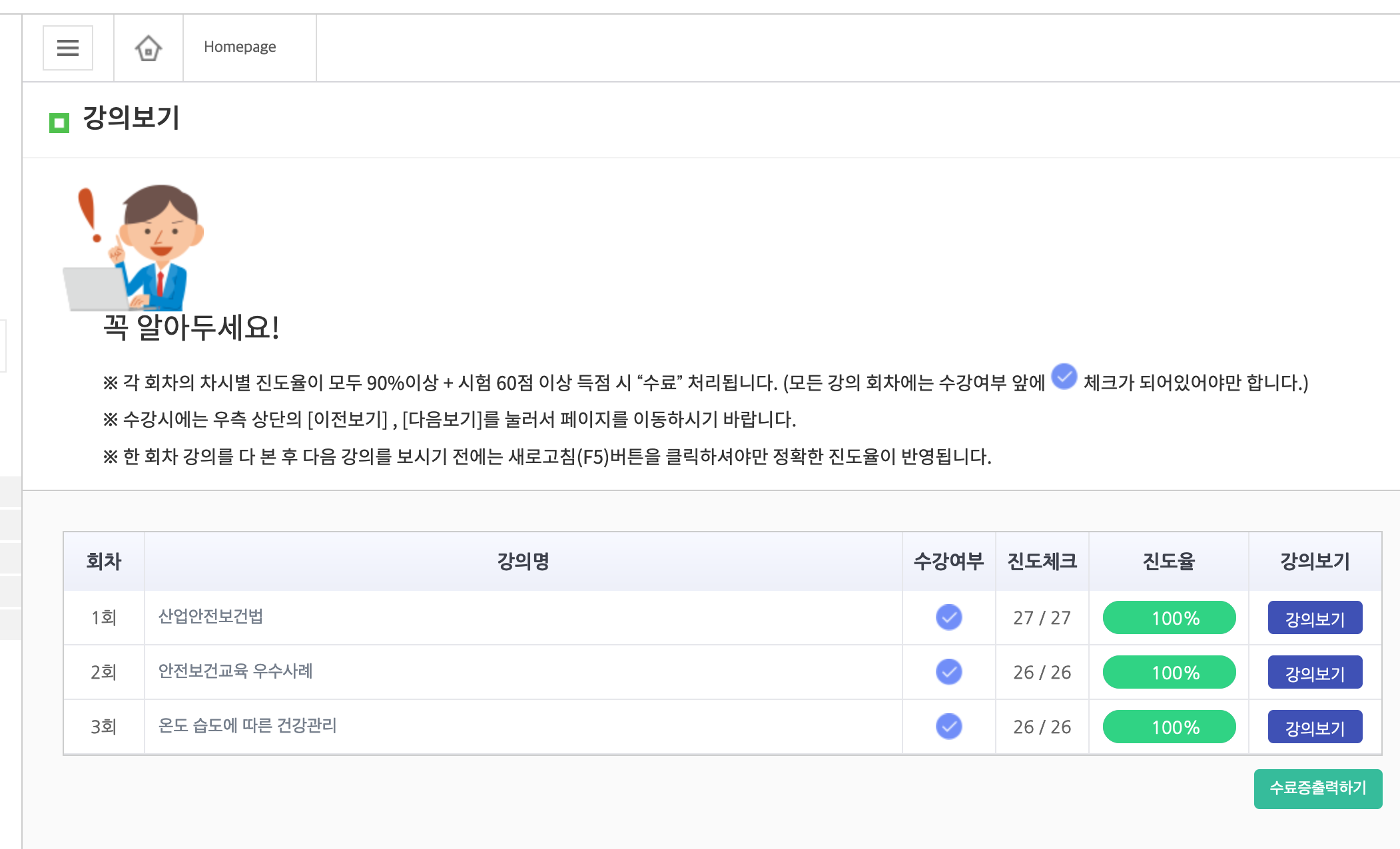 산업안전보건교육 (2021년 2분기) 3시간 수강 후 10문제 시험이 100 점인데, 각 10점씩이고, 60점 이상 수료다