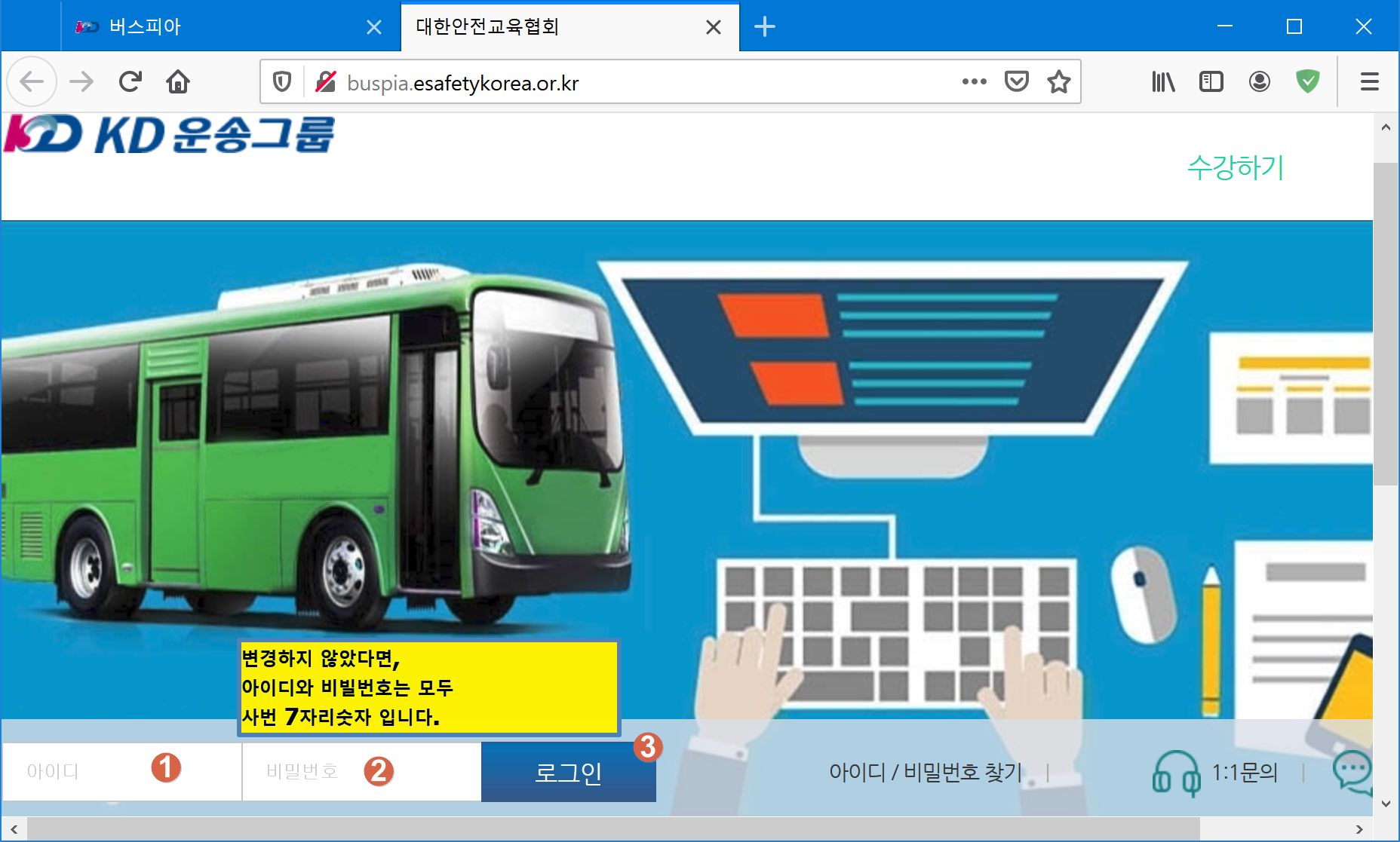 KD운송그룹 산업안전 교육 사이트 접속 주소: http://buspia.esafetykorea.or.kr/