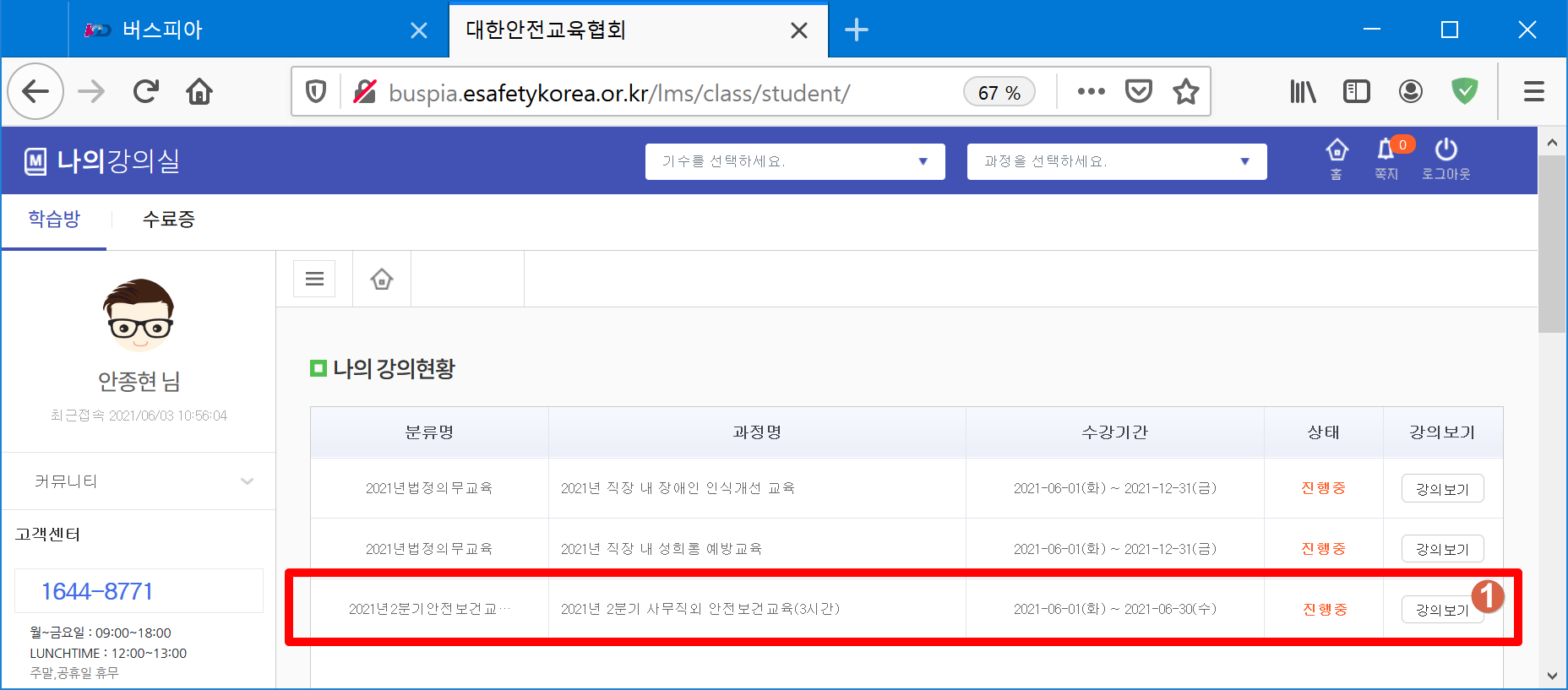 - 산업안전보건교육 "강의보기" 클릭하여 과정명 수강 홈으로 이동