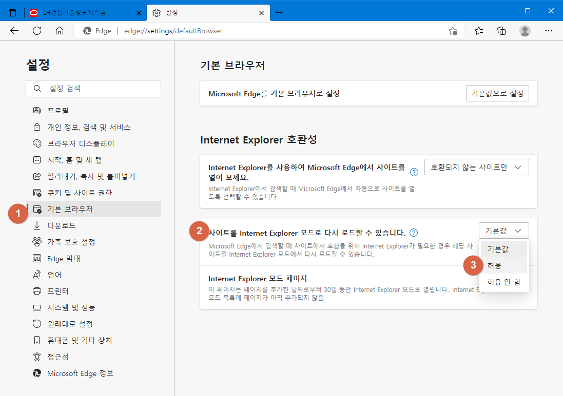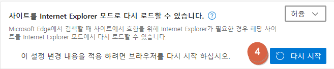 설정화면에서 ①기본브라우저를 클릭하고, ② IE 모드 다시 로드에서 ③ 허용을 선택한 후 ④ 다시 시작합니다.