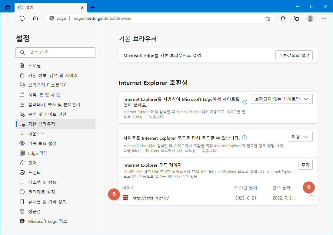 설정 > ② 기본브라우저 > ② 모드 페이지 추가 > ③ 사이트 주소 입력 > ④ 추가 > ⑤ 추가된 사이트 확인, (필요 없으면 삭제 ⑥)