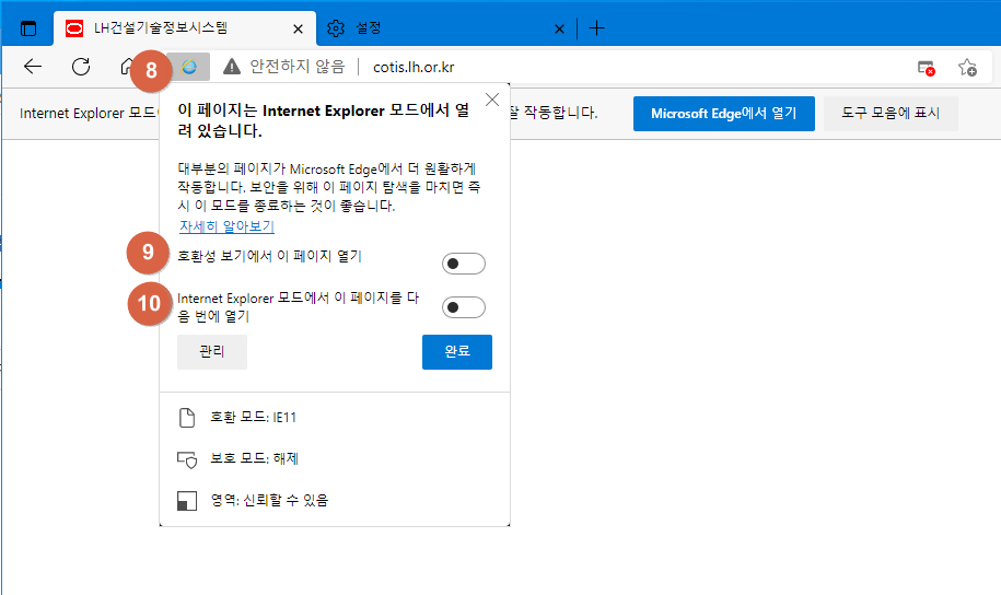⑧IE 버튼을 클릭해서, ⑨ 호환성 모드도 선택할 수 있고, ⑩ 30일간 설정 유지 관리도 할 수 있습니다.
