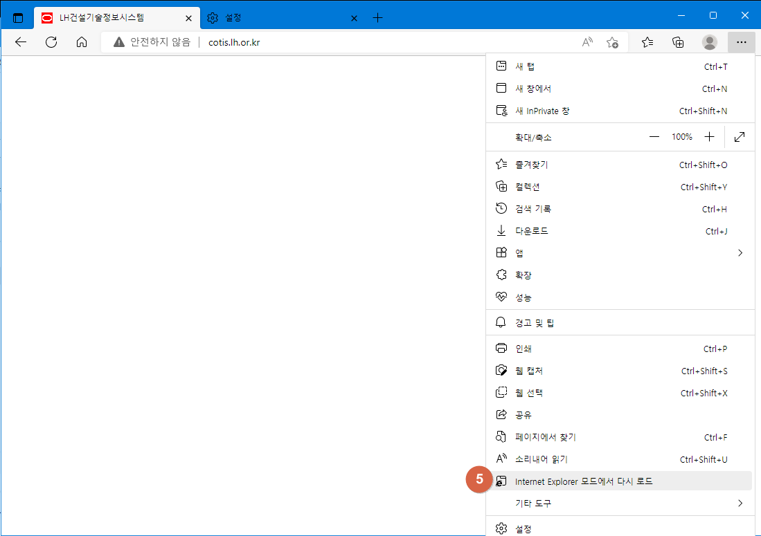 Edge 브라우저를 실행하고 우측 상단에 점 세개 클릭 후 하면, 좀 전에 없던 ⑤ IE 모드에서 다시로드 가 생겼습니다.