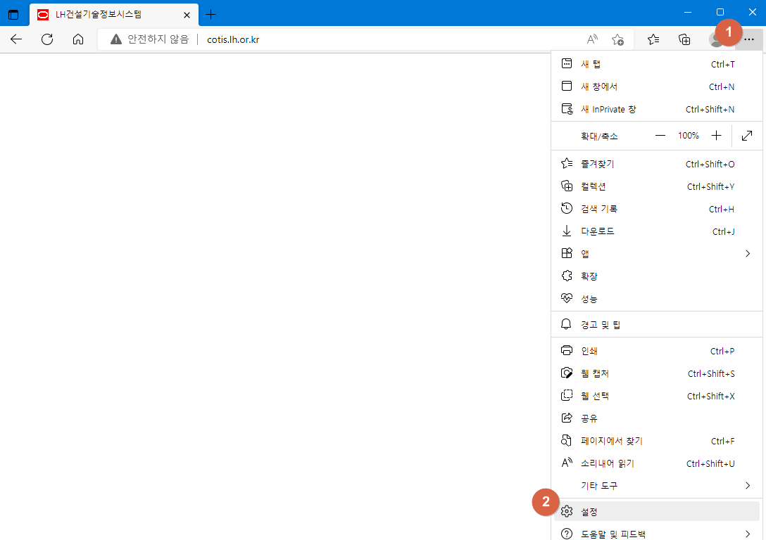 Edge 브라우저를 실행하고 우측 상단에 ①점 세개 클릭 후, ② 설정을 클릭합니다.