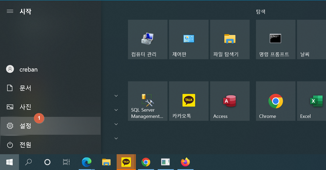 1. 윈도우 시작 버튼 누르고, ① 설정 클릭