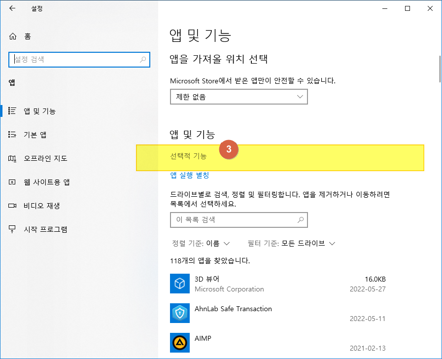 2. ② 앱 (설치제거, 기본값, 옵션 기능) 클릭