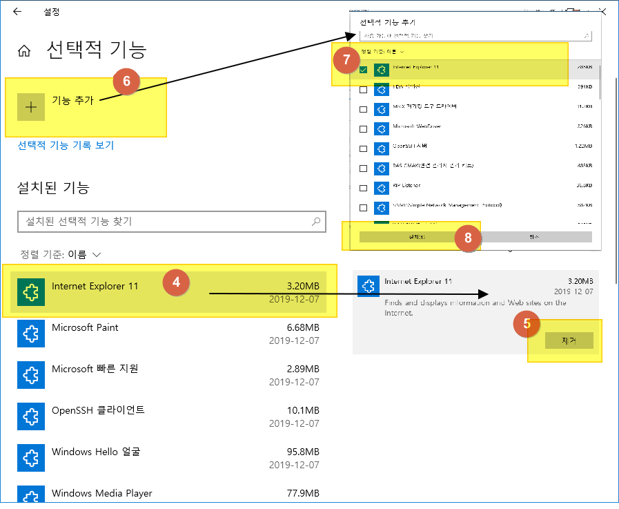 ⑥ 기능 추가 클릭, ⑦ 선택적 기능 추가 IE 11 선택 후 ⑧ 설치 를 진행한다.