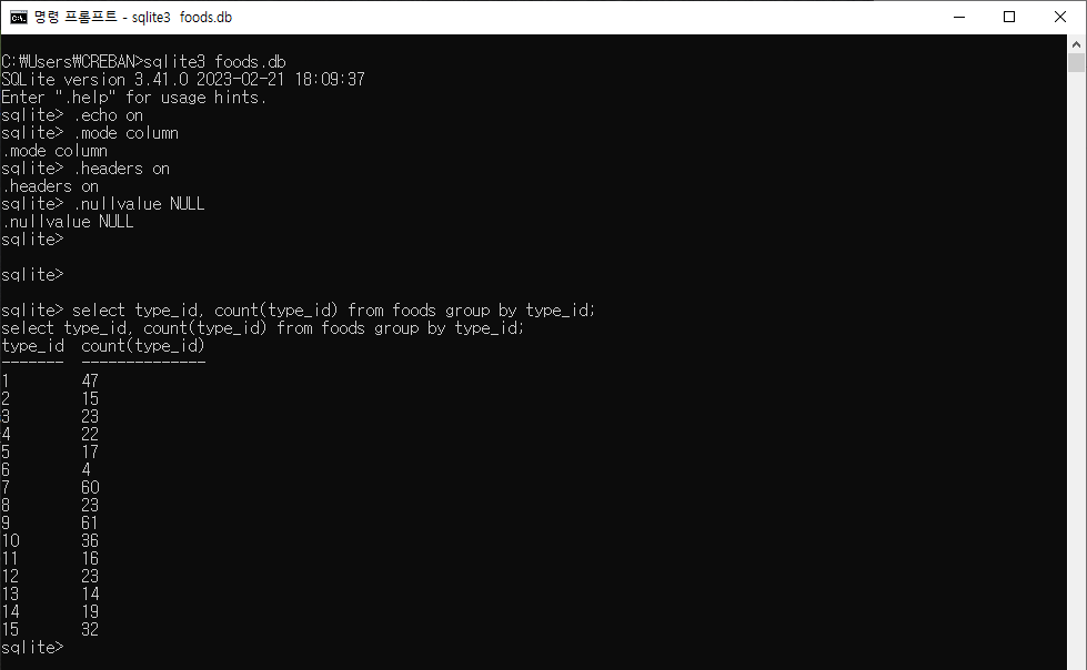 sqlite> select type_id, count(type_id) from foods group by type_id;