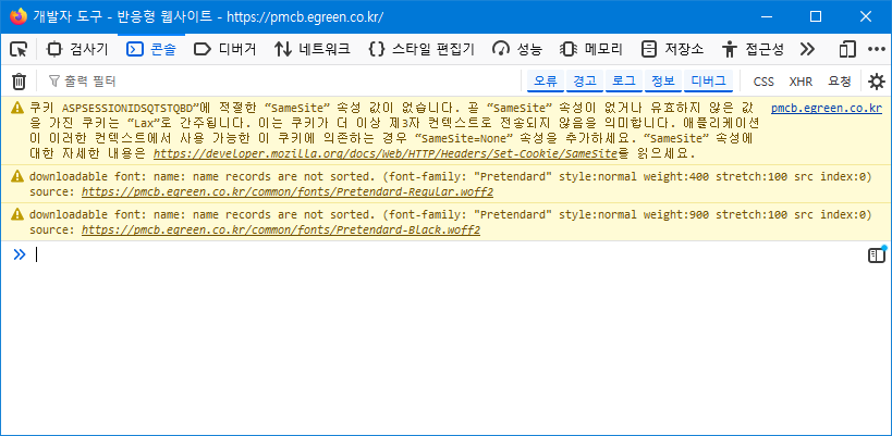 웹폰트 파일을 잘못 다운받으시는 경우, 웹 페이지에 정상적으로 폰트가 출력되지 못하며, 콘솔에서 로그를 보면 관련한 에러가 나타날 수 있습니다. 이런 경우는 ③ 웹폰트 변환하기를 다시 진행 후 업로드 사용하시기 바랍니다.