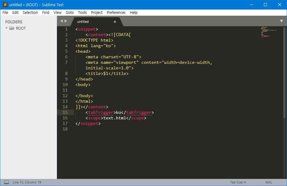 - 파일 이름은 원하는 대로 설정할 수 있지만, 확장자는 .sublime-snippet이어야 합니다.