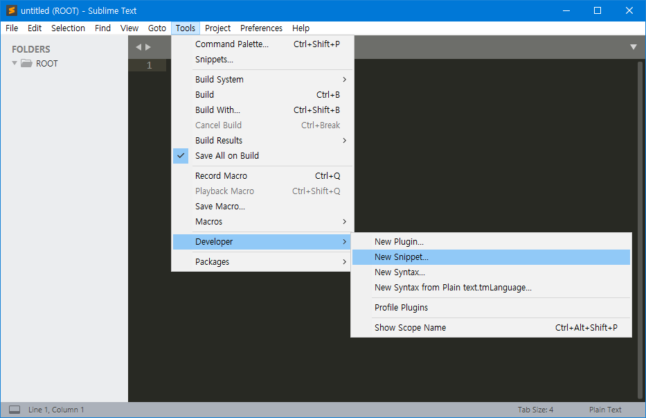 - Sublime Text 3에서 Tools 메뉴를 열고 Developer > New Snippet...을 선택합니다.
