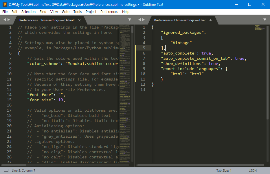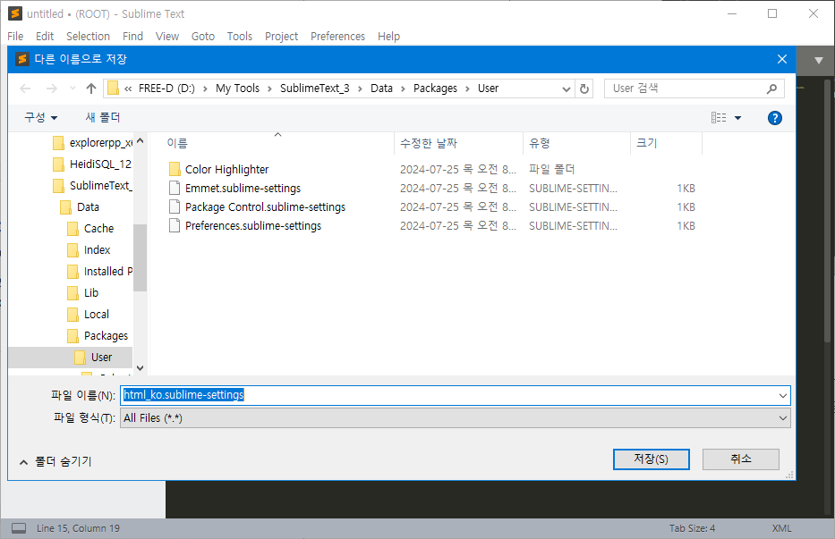 - 예: html_ko.sublime-settings