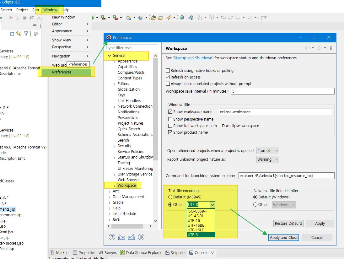 Windows > Preferences > General > Workspace > Text file encoding 을 UTF-8로 변경