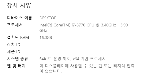 가상머신이 설치된 컴퓨터의 사양은 다음과 같다.