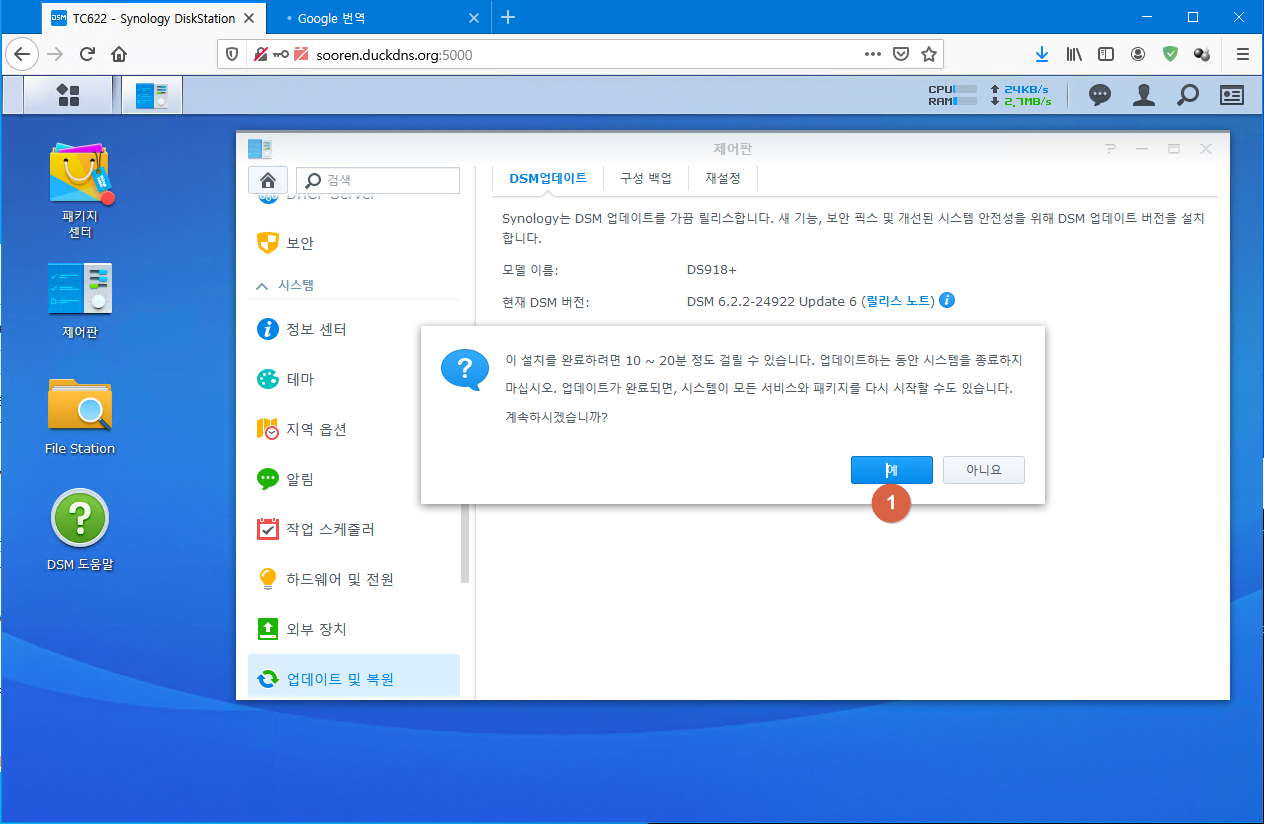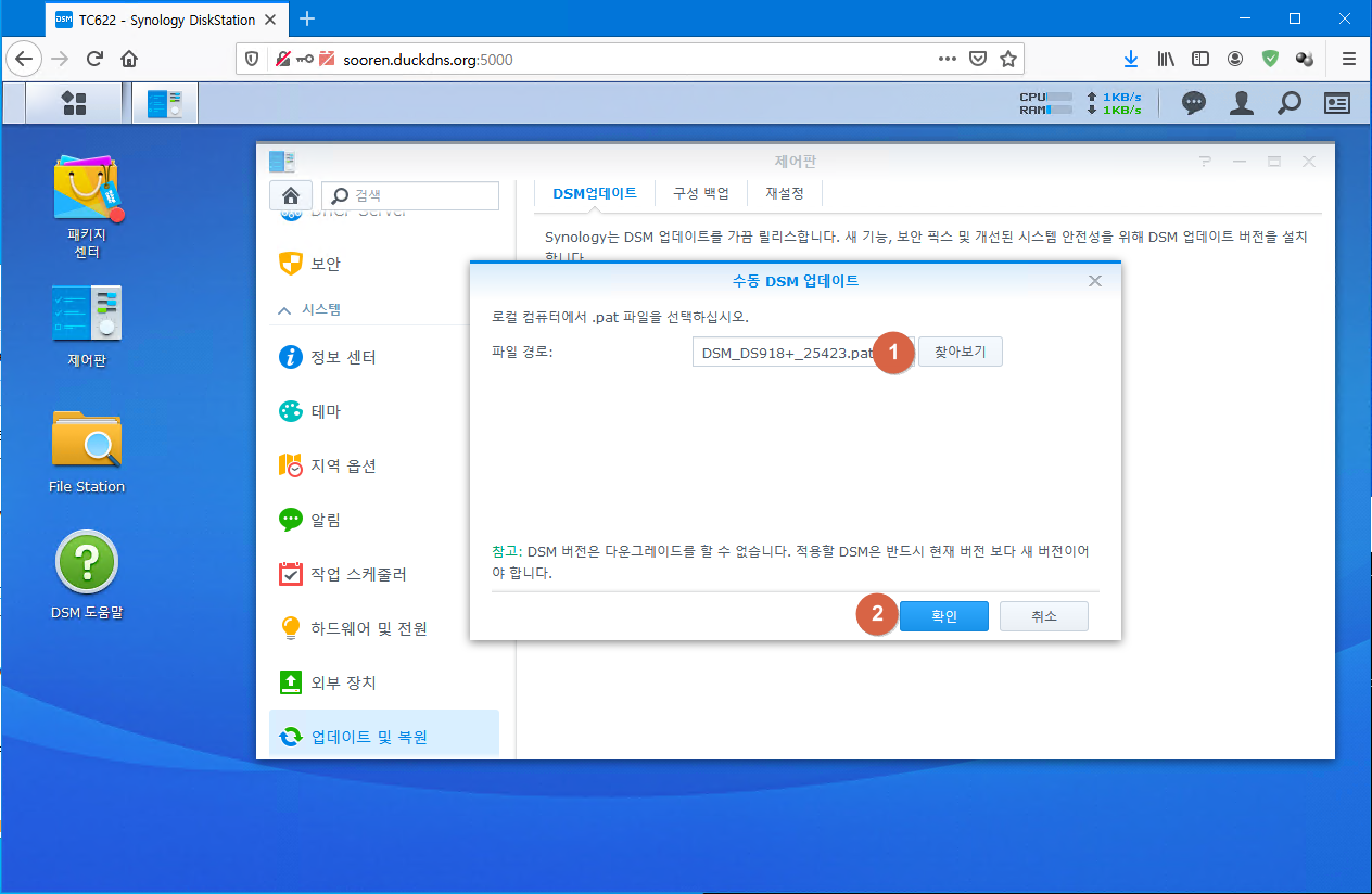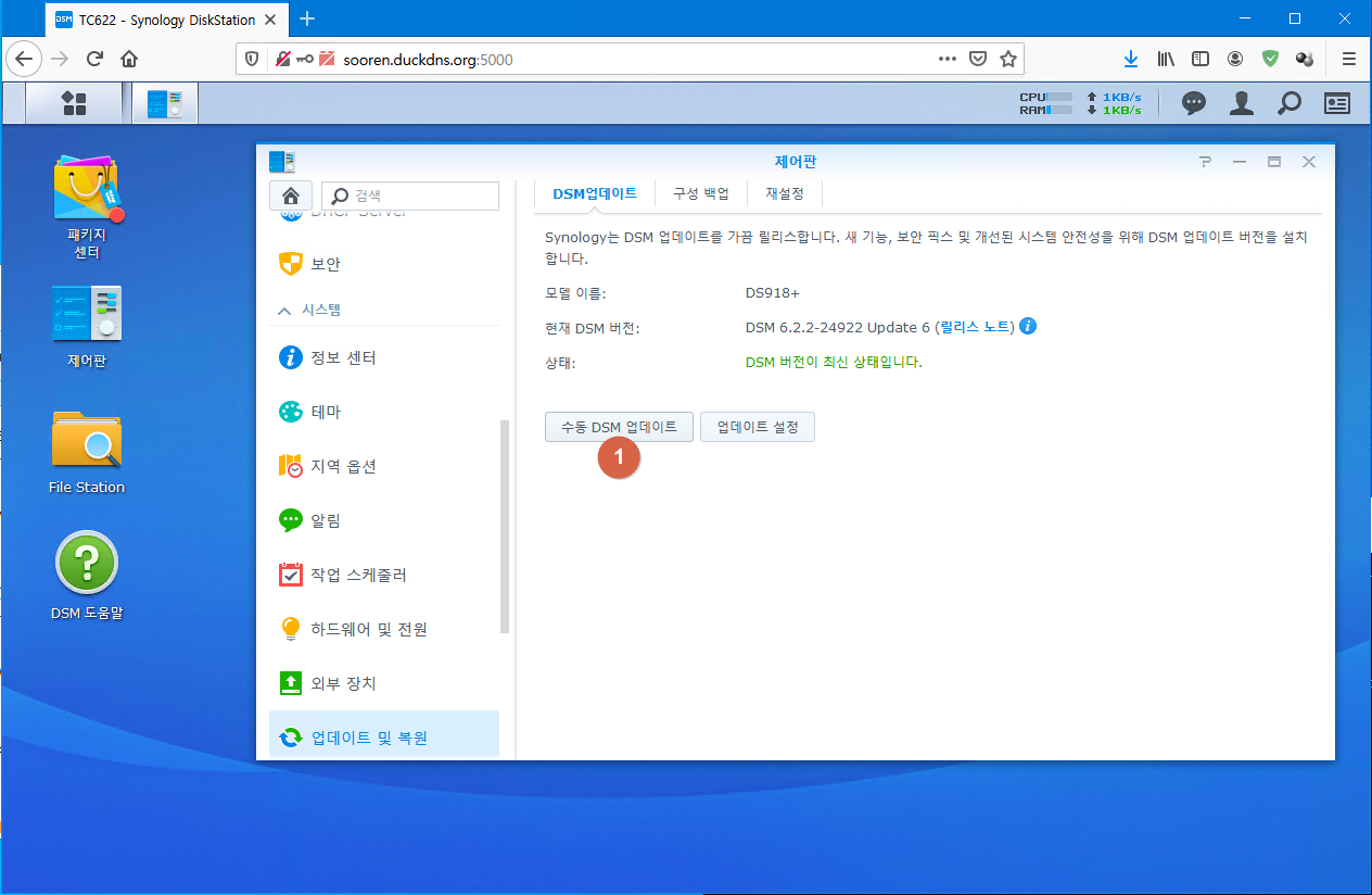 제어판 > 시스템 > 업데이트 및 복원 > DSM 업데이트 > 수동 DSM 업데이트 클릭
